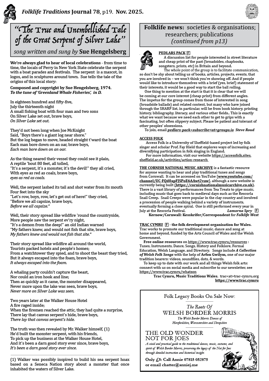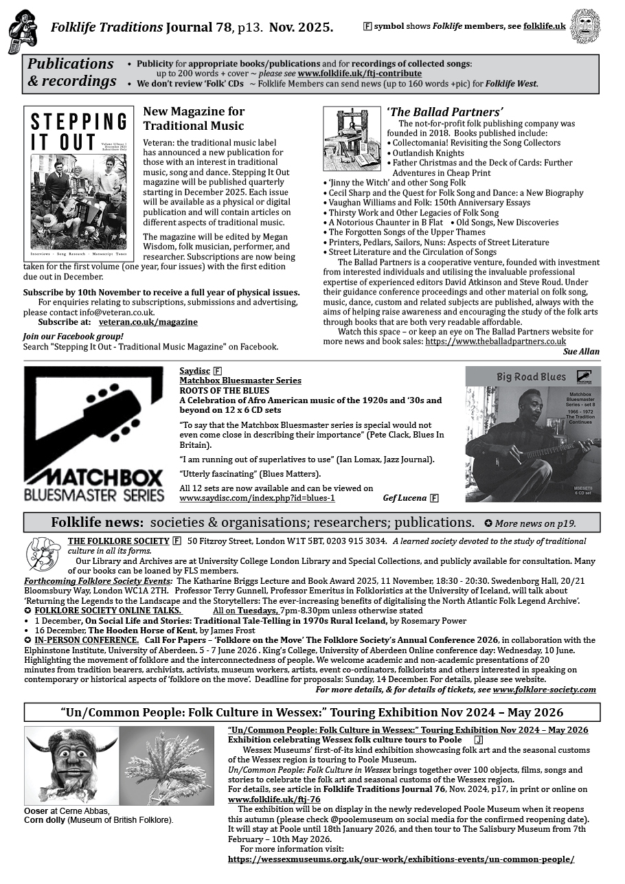 - New traditional music magazine; The Ballad Partners; Saydisc; Folklore Society; p13.