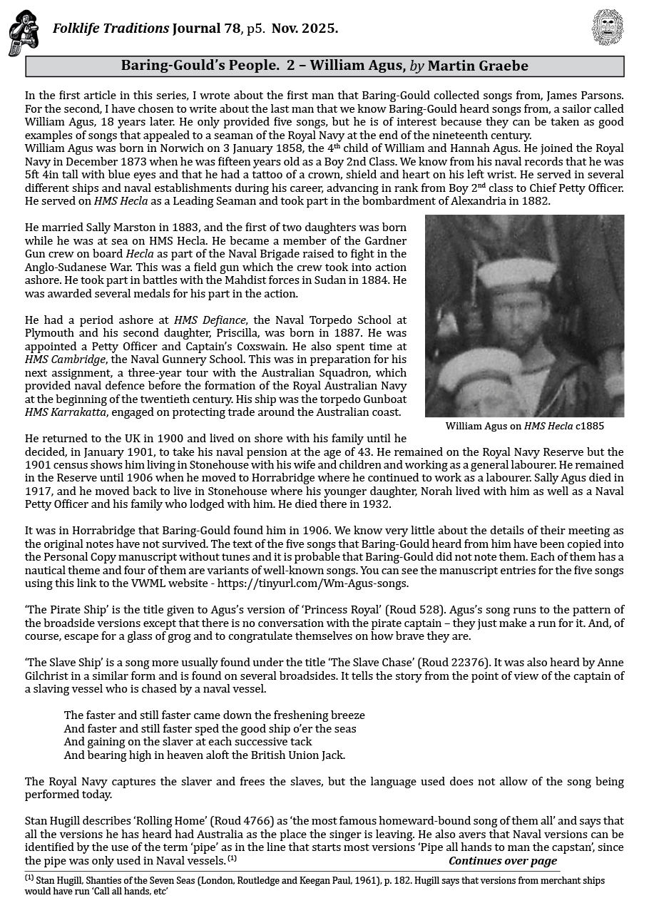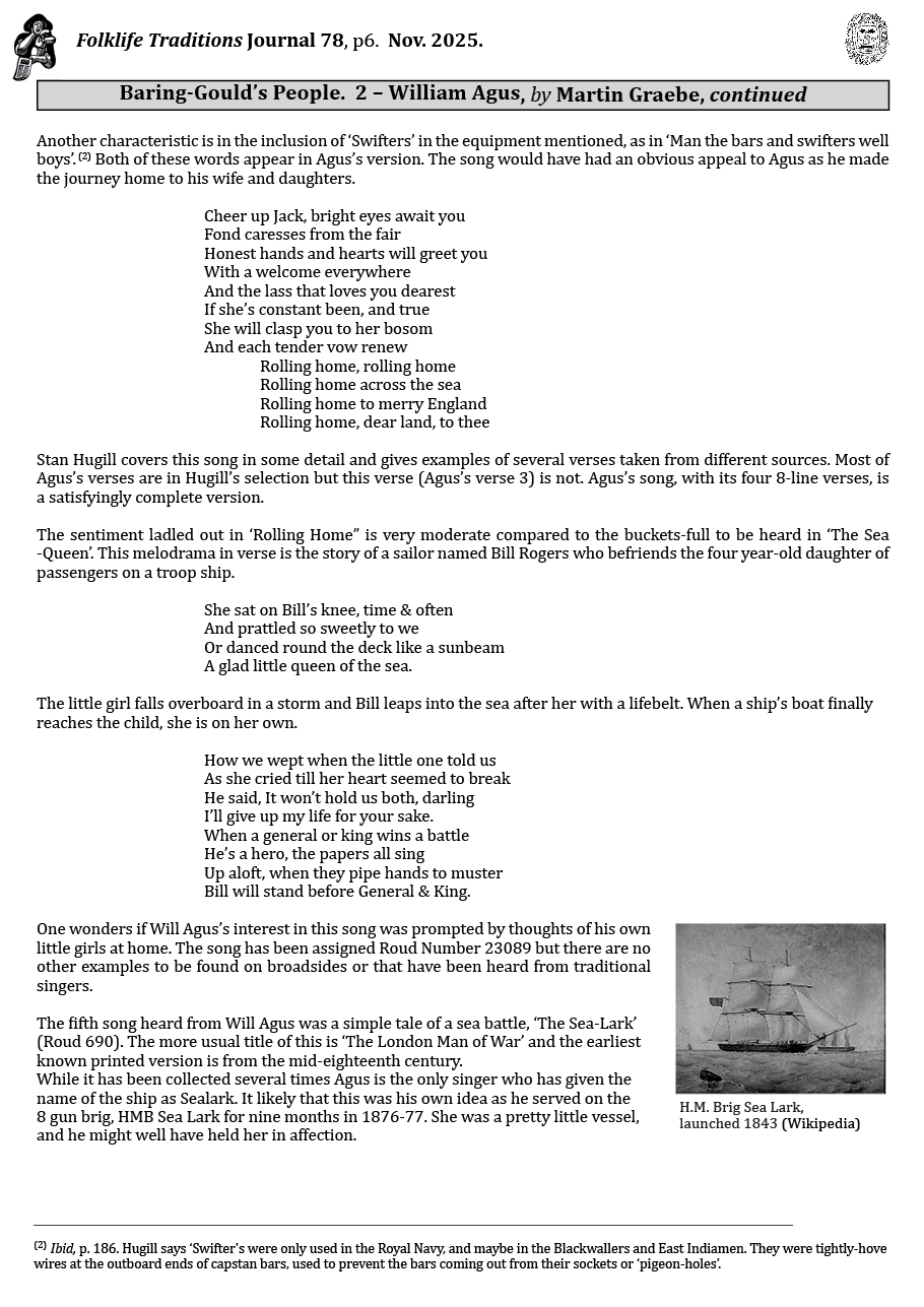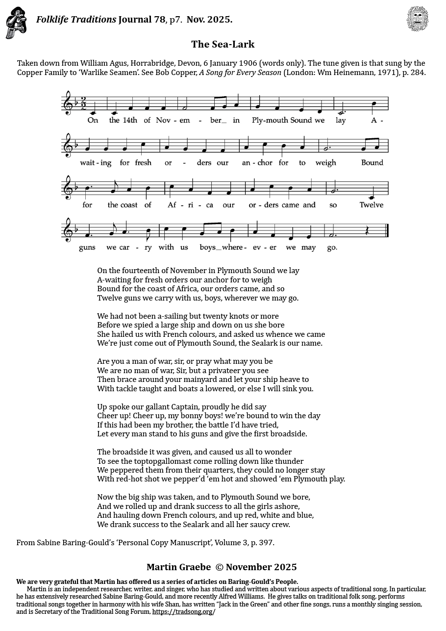 - Baring-Gould’s People. 2 – William Agus, by Martin Graebe, including song & music The Sea-Lark, pp5-7