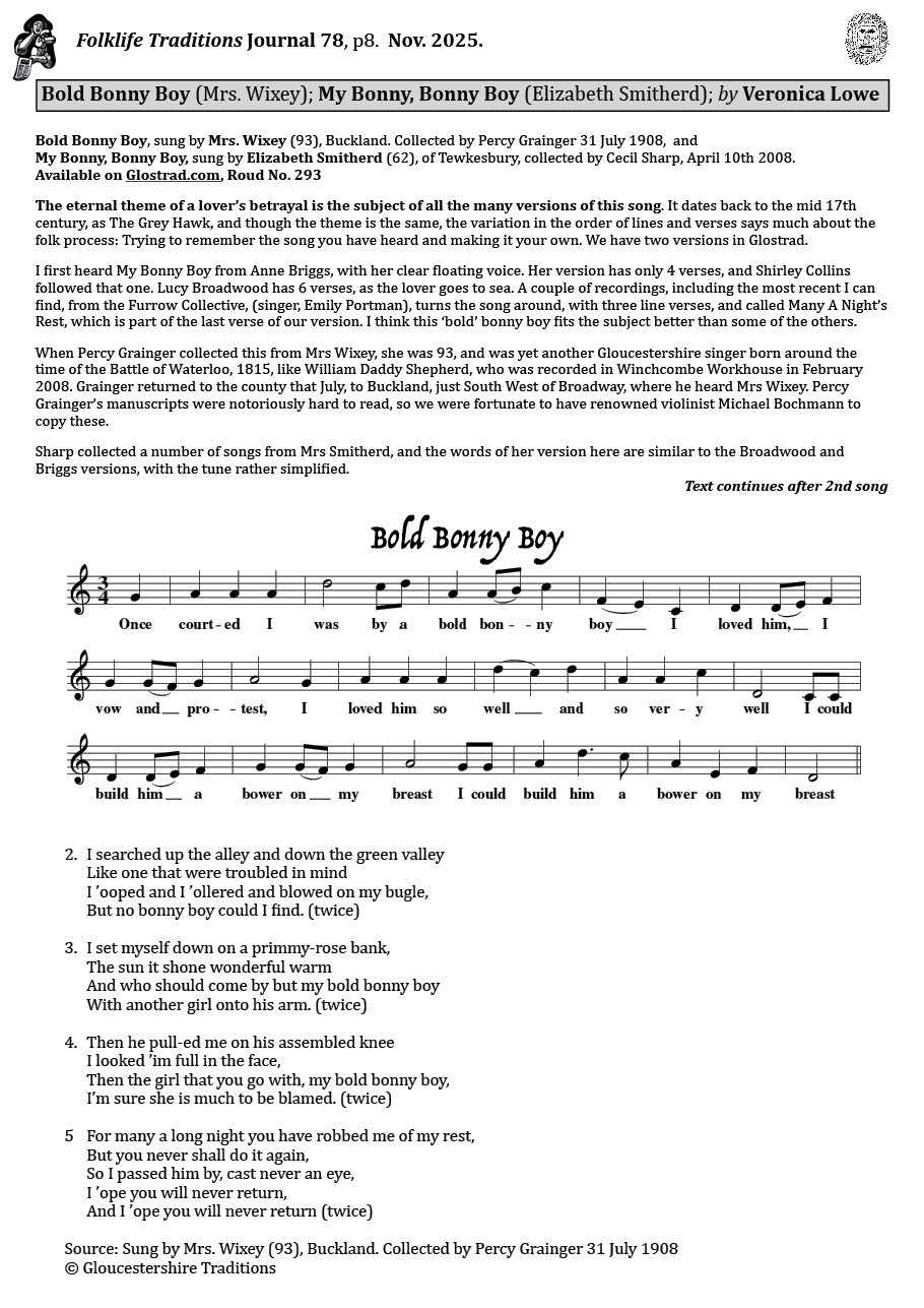 - Bold Bonny Boy (Mrs. Wixey) and My Bonny, Bonny Boy (Elizabeth Smitherd); by Veronica Lowe, pp8-9