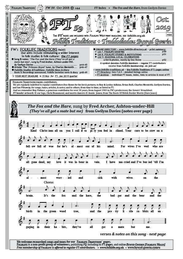 - Song & notes: ‘The Fox and the Hare (They’ve all got a mate but me)’, sung by Fred Archer, Ashton-under-Hill. By Gwilym Davies p44-45
