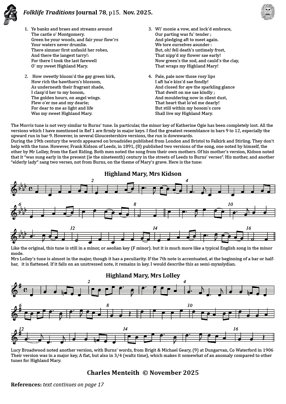 - Highland Mary, Tune and Song, by Charles Menteith, pp14-15, 17