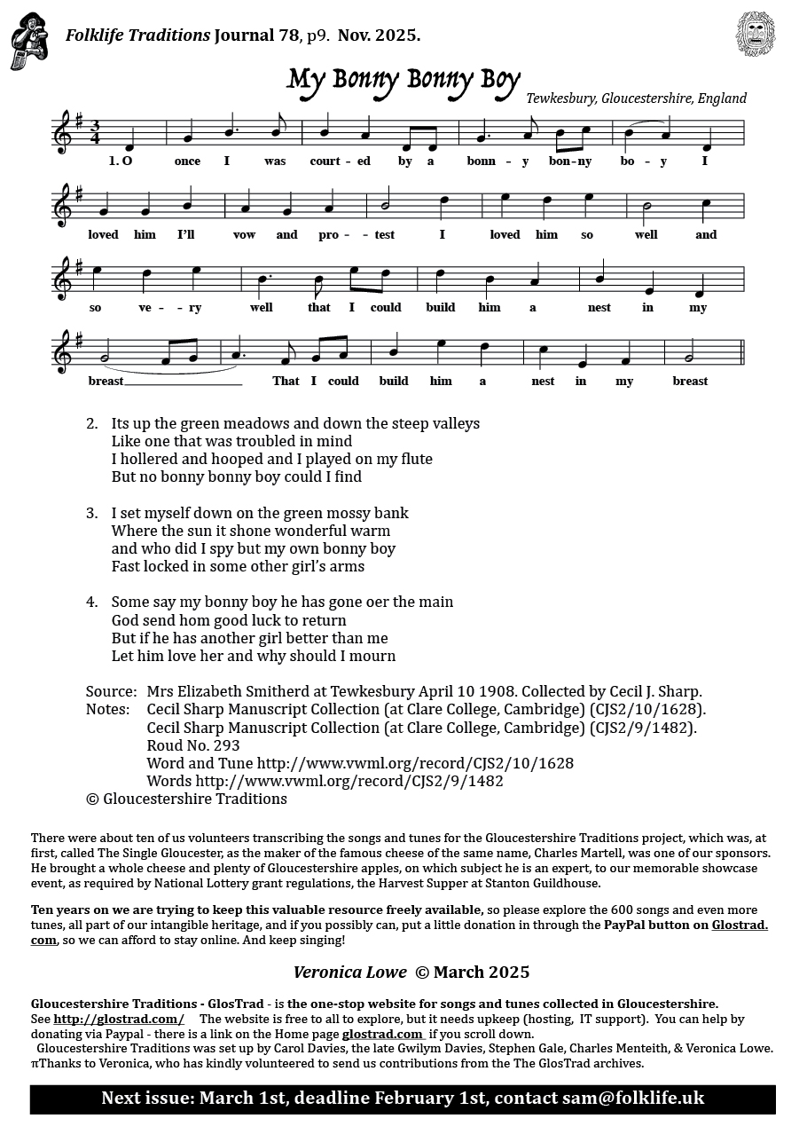 - Bold Bonny Boy (Mrs. Wixey) and My Bonny, Bonny Boy (Elizabeth Smitherd); by Veronica Lowe, pp8-9